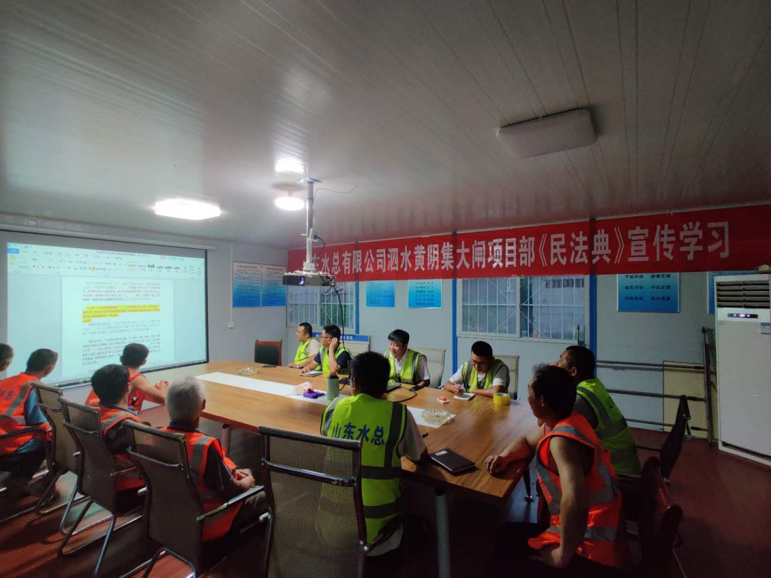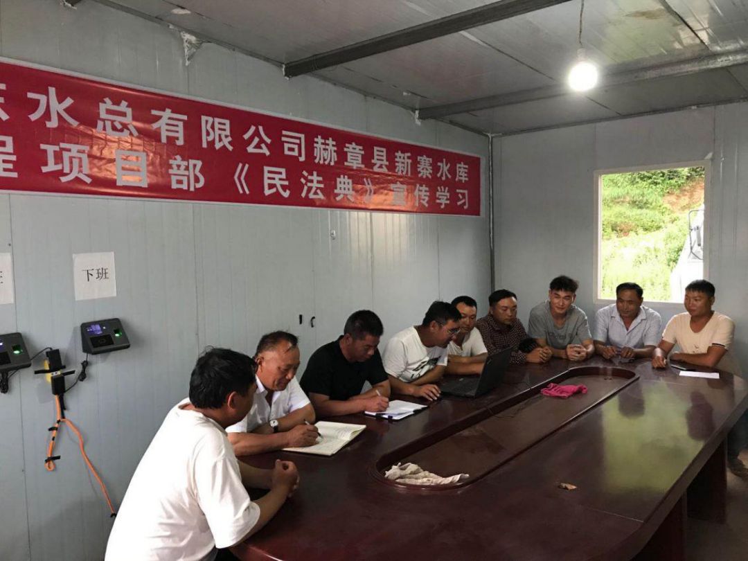为响应总公司法务与清收办公室组织的“《民法典》宣传月”活动, 7月23日晚上,泗水县黄阴集大闸除险加固工程项目经理部在工地会议室召开《民法典》学习宣贯会议、2020年7月25日,赫章县新寨水库工程项目部全体成员在会议室进行《民法典》宣传学习、曲阜2019年重点水利建设项目施工 一标段在2020年7月28日进行《民法典》学习、平塘县擦耳岩水库工程项目2020年7月29日进行《民法典》学习、宣贯情况汇报如下: