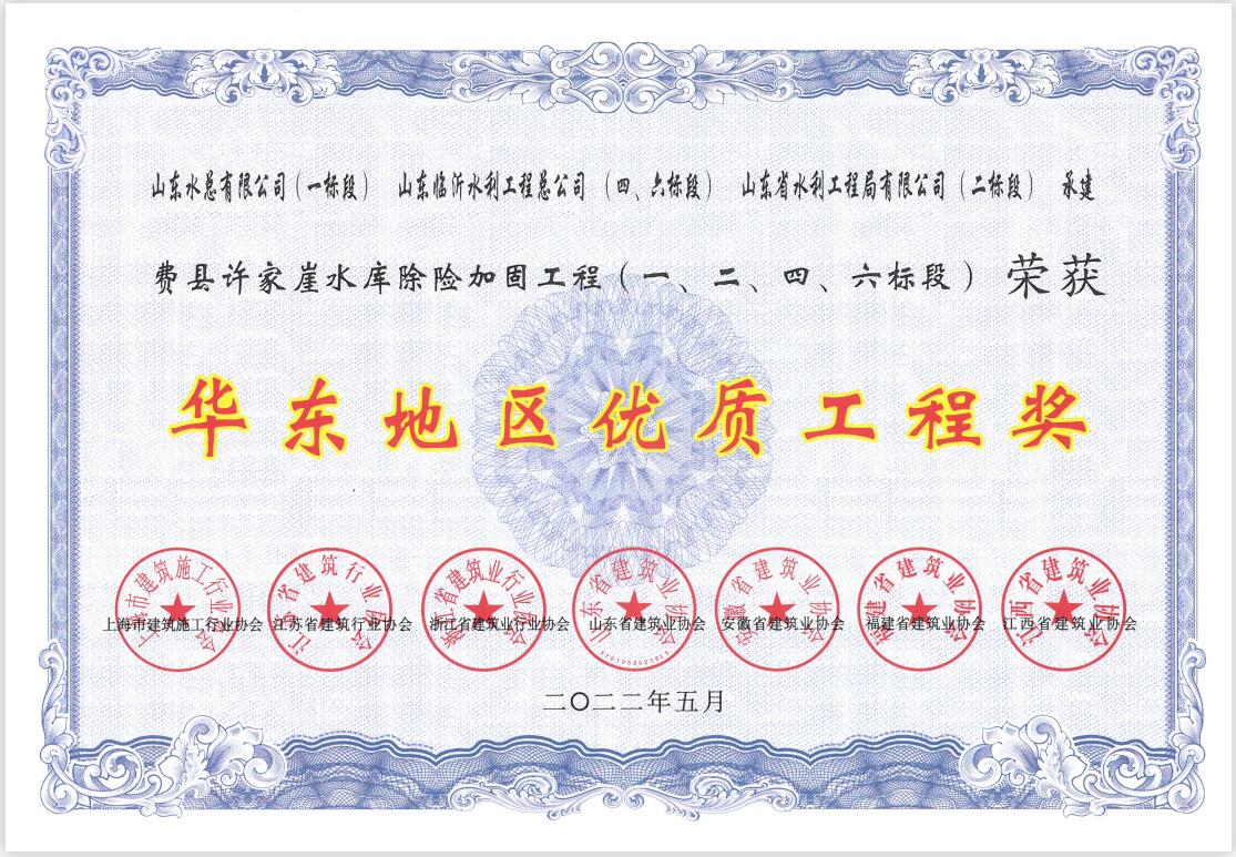 近日,公司承建的费县许家崖水库除险加固工程荣获2021年度“华东地区优质工程奖”;泗水县泗河黄阴集大闸除险加固工程荣获2020-2021年度“山东省优质结构工程奖”。荣获这两个奖项,是公司在省级质量奖项方面的又一次突破。在工程创优上,公司始终坚持以企业发展为核心,践行“干一个工程,树一块丰碑”的质量方针。