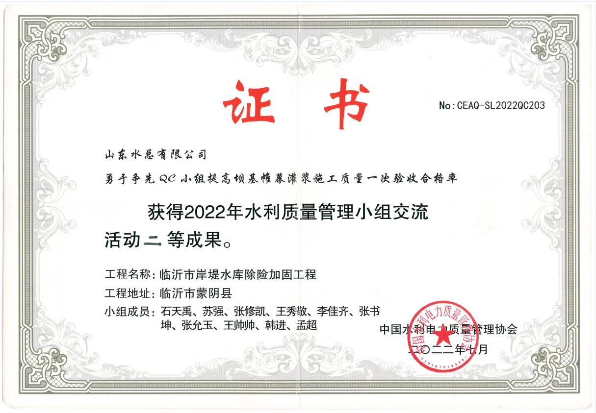 近日,中国水利电力质量管理协会2022年水利质量管理小组交流活动结果与获奖名单揭晓,公司申报的《提高钢坝闸闸墙外观质量一次验收合格率》获得一等成果、《提高混凝土拱坝止水埋设一次验收合格率》《提高大体积现浇混凝土强约束区温度控制水平》《提高坝基帷幕灌浆施工质量一次验收合格率》3项成果获得二等成果。